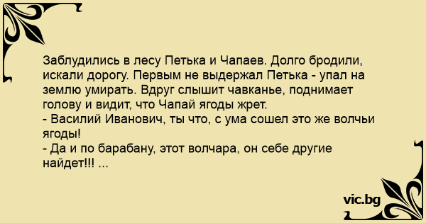 Заблудились в лесу Петька и Чапаев. Долго бродили, искали дорогу. Первым не выдержал Петька - упал на землю умирать. Вдруг слышит чавканье, поднимает голову и видит, что Чапай ягоды жрет.