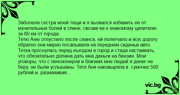 Тетю Аню отпустило после сеанса, ей полегчало и всю дорогу обратно она мирно посапывала на переднем сиденьи авто. Тетка проснулась перед въездом в город и стада настаивать, что обязательно должна дать мне деньги на бензин. Мои уговоры, что с пенсионеров и близких мне людей я денег не беру, не были услышаны. Тетя Аня наковыряла в сумочке 500 рублей и, размахивая пятисоткой, пыталась засунуть мне в подстаканник на парпризе смятую купюру. Я отодвигал ее руку с купюрой обратно в ее же сумочку, а она вновь и вновь пыталась достать до подстаканника. Тем временем наша машина приближалась к въезду в город, а на въезде был пост ГАИ и доблестный гаишник махнул нам своей "волшебной палочкой", показывая место куда я должен припарковаться. Тут меня посетила мысль, как избавиться от гаишника и как успокоить тетку с ее благодарностью. Я остановился прямо возле гаишника, а не туда куда он показывал жезлом, опустил боковое стекло, тетка при этом пятисотку держала в руке, а я отстраняясь от руки с купюрой как от заразной болезни произнес фразу: - Командир, ну хоть Вы объясните бабушке, что полицейские денег не берут! Гаишник, кинув беглый взгляд на купюру, то на меня, то на бабушку, то опять на купюру, включил анализ и заплетающимся голосом с улыбкой произнес: - Нет, нет, не берем! Ну вот, сказал я тете Ане, говорю же тебе что гаишники денег не берут, закрыл окно и поехал, а тетя Аня до самого дома ехала и ее раздирало смехом до кашля.