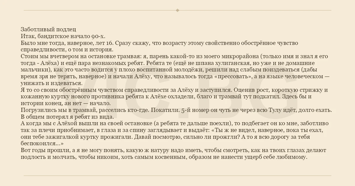 Заботливый подлец Итак, бандитское начало 90-х. Было мне тогда, наверное, лет 16. Сразу скажу, что возрасту этому свойственно обострённое чувство справедливости, о том и история. Стоим мы вчетвером на остановке трамвая: я, парень какой-то из моего микрорайона (только имя и знал я его тогда - Алёха) и ещё пара незнакомых ребят. Ребята те (ещё не шпана хулиганская, но уже и не домашние мальчики), как это часто водится у плохо воспитанной молодёжи, решили над слабым поиздеваться (дабы время зря не терять, наверное) и начали Алёху, что называлось тогда «прессовать», а на языке человеческом — унижать и издеваться. Я то со своим обострённым чувством справедливости за Алёху и заступился. Оценив рост, короткую стрижку и кожанную куртку нового противника ребята к Алёхе охладели, благо и трамвай тут подкатил. Здесь бы и истории конец, ан нет — начало. Погрузились мы в трамвай, расселись кто-где. Покатили. 5-й номер он чуть не через всю Тулу идёт, долго ехать. В общем потерял я ребят из вида. А когда мы с Алёхой вышли на своей остановке (а ребята те дальше поехли), то подбегает он ко мне, заботливо так за плечи приобнимает, в глаза и за спину заглядывает и выдаёт: «Ты ж не видел, наверное, пока ты ехал, они тебе зажигалкой куртку прожигали. Давай посмотрю, сильно ли прожгли? А то я всю дорогу за тебя беспокоился...» Вот годы прошли, а я не могу понять, какую ж натуру надо иметь, чтобы смотреть, как на твоих глазах делают подлость и молчать, чтобы никоим, хоть самым косвенным, образом не нанести ущерб себе любимому.