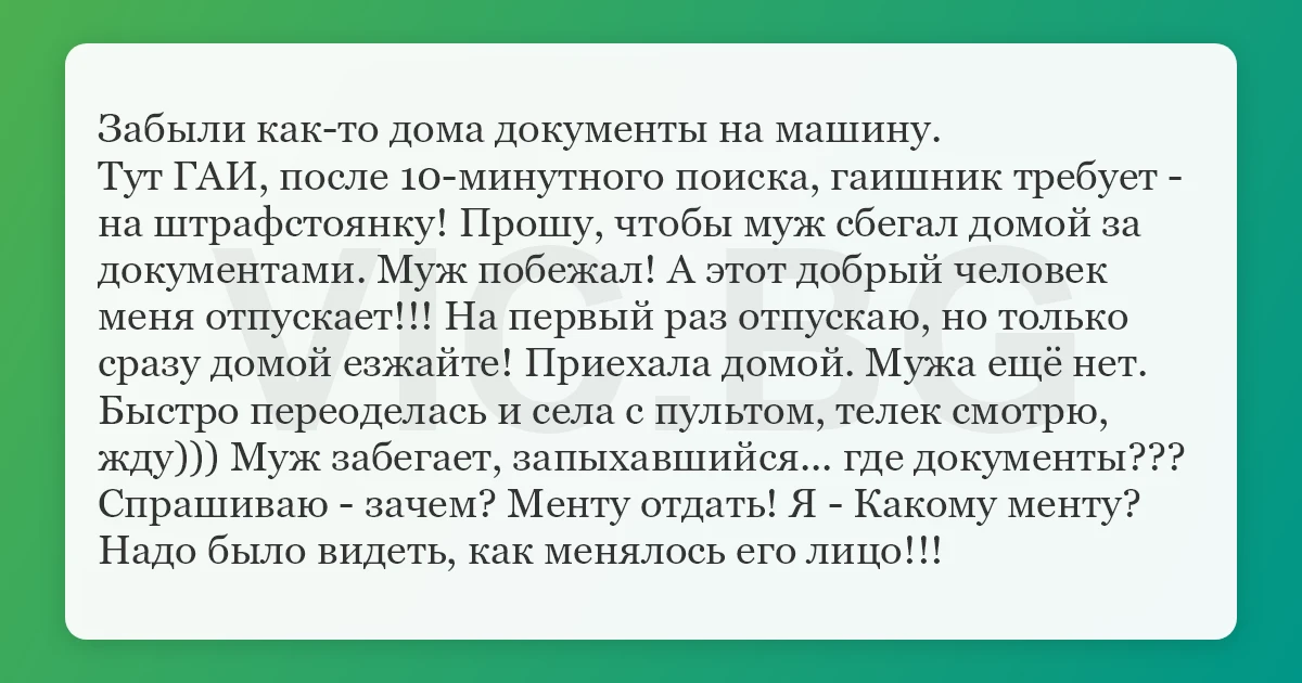 Забыли как-то дома документы на машину. Тут ГАИ, после 10-минутного поиска, гаишник требует - на штрафстоянку! Прошу, чтобы муж сбегал домой за документами. Муж побежал! А этот добрый человек меня отпускает!!! На первый раз отпускаю, но только сразу домой езжайте! Приехала домой. Мужа ещё нет. Быстро переоделась и села с пультом, телек смотрю, жду))) Муж забегает, запыхавшийся... где документы??? Спрашиваю - зачем? Менту отдать! Я - Какому менту? Надо было видеть, как менялось его лицо!!!