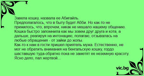 Завела кошку, назвала ее Абигайль. Предполагалось, что в быту будет Абби. Но как-то не прижилось, что, впрочем, никак не мешало нашему общению. Кошка быстро запомнила как мы зовем друг друга и кота, а дальше, реагируя на интонацию, полагаю, отзывалась на любые обращения - от зайки до жопы. Как-то к нам в гости пришел приятель мужа. Естественно, не мог не обратить внимания на бенгальскую кошку, гордо шаставшую туда-обратно пока не заметят ее неземную красоту. Ясно дело, пал жертвой кошачьего обаяния. Ну и спрашивает, мол, как назвали девчушку-то. Говорю "Абигайль". Приятель изумленно "Как?" (согласна, имя для русского слуха непривычное :)). Повторяю. Он: "А сокращенно как?" И тут мы, естествнно не сговариваясь, практически хором. Я: "Бусинка" Муж: "Жучка" Сын: "Тварь". Кошка заинтересованно крутит головой, мол, чего вам, хороняки, надо. Приятель, ухмыляясь: "Отличное имя! И, главное, сокращений много:)".