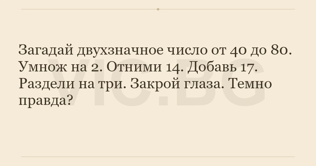 Загадай двухзначное число от 40 до 80. Умнож на 2. Отними 14. Добавь 17. Раздели на три. Закрой глаза. Темно правда?