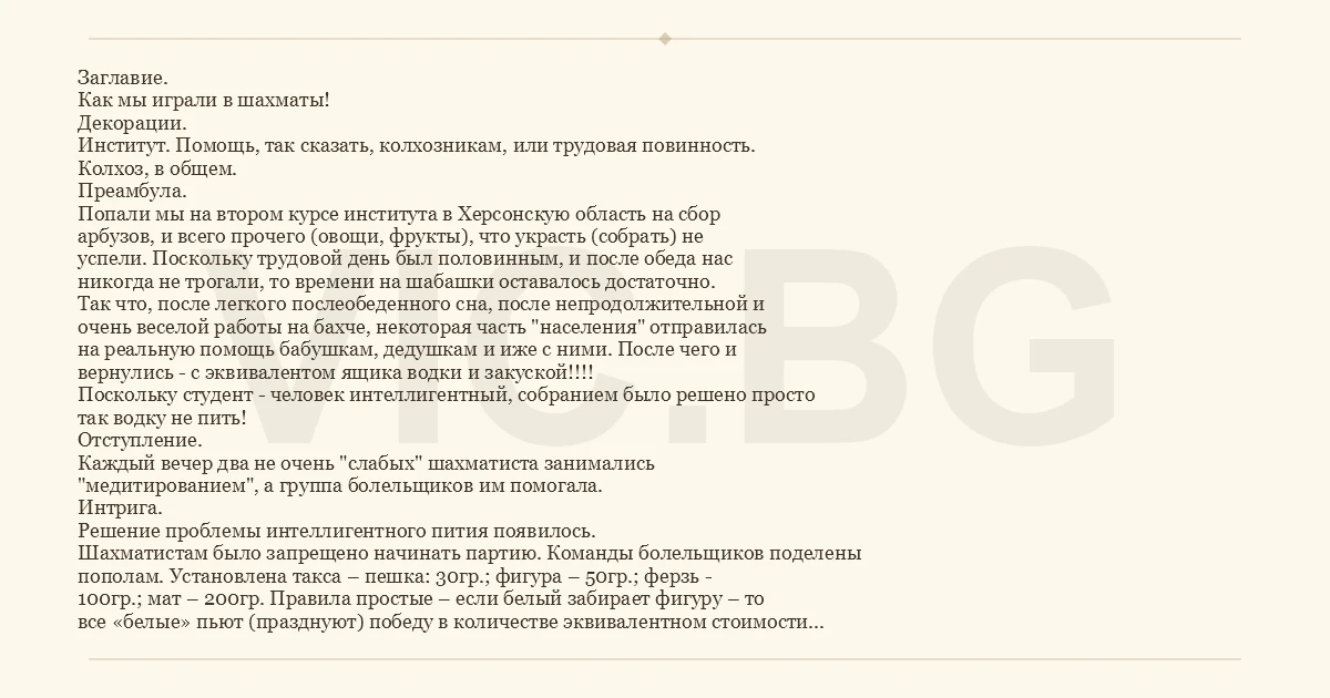 Заглавие. Как мы играли в шахматы! Декорации. Институт. Помощь, так сказать, колхозникам, или трудовая повинность. Колхоз, в общем. Преамбула. Попали мы на втором курсе института в Херсонскую область на сбор арбузов, и всего прочего (овощи, фрукты), что украсть (собрать) не успели. Поскольку трудовой день был половинным, и после обеда нас никогда не трогали, то времени на шабашки оставалось достаточно. Так что, после легкого послеобеденного сна, после непродолжительной и очень веселой работы на бахче, некоторая часть "населения" отправилась на реальную помощь бабушкам, дедушкам и иже с ними. После чего и вернулись - с эквивалентом ящика водки и закуской!!!! Поскольку студент - человек интеллигентный, собранием было решено просто так водку не пить! Отступление. Каждый вечер два не очень "слабых" шахматиста занимались "медитированием", а группа болельщиков им помогала. Интрига. Решение проблемы интеллигентного пития появилось. Шахматистам было запрещено начинать партию. Команды болельщиков поделены пополам. Установлена такса – пешка: 30гр.; фигура – 50гр.; ферзь - 100гр.; мат – 200гр. Правила простые – если белый забирает фигуру – то все «белые» пьют (празднуют) победу в количестве эквивалентном стоимости фигуры. Сама игра. Е2-Е4 D7-D5 Белые задумались. Болельщики белых – «Че думаешь? Пешку бери!! Бери пешку!» Взял! Черные задумались. Болельщики черных – «А ты че думаешь? Бери! Вон видишь, они уже выпили! Им хорошо!» Черный шахматист – «я подумаю»! Болельщики черных – «Потом нах… думать будешь, Карпов! Бери пешку!» Взял! Развязка. Не буду утомлять дальше! Помню, как кричали – «Бей Ферзем коня, не пожалеешь!!!!»……Потом не помню…. Партию не доиграли…. Признали ничьей! А мы счет вели….