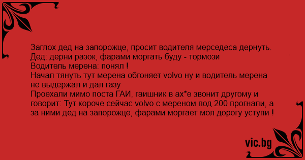 Проехали мимо поста ГАИ, гаишник в ах*е звонит другому и говорит: Тут короче сейчас volvo с мереном под 200 прогнали, а за ними дед на запорожце, фарами моргает мол дорогу уступи !