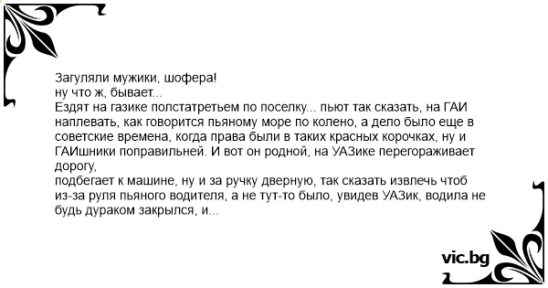 Загуляли мужики, шофера! ну что ж, бывает... Ездят на газике полстатретьем по поселку... пьют так сказать, на ГАИ наплевать, как говорится пьяному море по колено, а дело было еще в советские времена, когда права были в таких красных корочках, ну и ГАИшники поправильней. И вот он родной, на УАЗике перегораживает дорогу, подбегает к машине, ну и за ручку дверную, так сказать извлечь чтоб из-за руля пьяного водителя, а не тут-то было, увидев УАЗик, водила не будь дураком закрылся, и сидит. Ну ГАИшник соответственно кипятится ЩА стекла выбью и т.д. и т.п. И тут водитель достает красные корки, рвет их на глазах у удивленного ГАИшника на мелкие кусочки и выбрасывает их в ветровичок со словами "Тебе права? На, подавись своими правами". Ну капитан очень удивился, покрутил пальцем у виска, а надо сказать, что в советские времена не так просто было права поменять, походил вокруг машины и... уехал. Изумленный пассажир, немного отойдя от шока, говорит водиле: - Ну ты, паря, и дуpak, ты зачем права-то порвал?!! - Сам ты дуpak!! Я профсоюзный билет порвал, - сказал мужик, заводя машину.