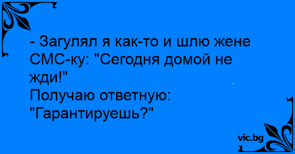 - Загулял я как-то и шлю жене СМС-ку: "Сегодня домой не жди!"