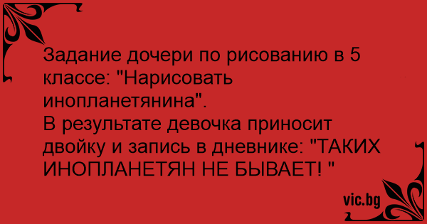 В результате девочка приносит двойку и запись в дневнике: "ТАКИХ ИНОПЛАНЕТЯН НЕ БЫВАЕТ! "