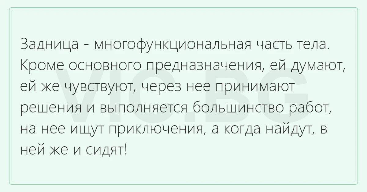 Задница - многофункциональная часть тела. Кроме основного предназначения, ей думают, ей же чувствуют, через нее принимают решения и выполняется большинство работ, на нее ищут приключения, а когда найдут, в ней же и сидят!