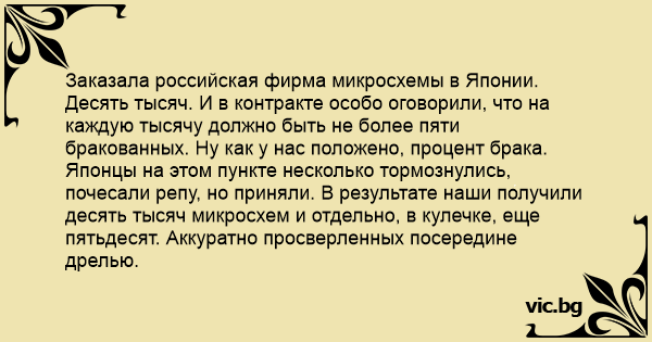 Заказала российская фирма микросхемы в Японии. Десять тысяч. И в контракте особо оговорили, что на каждую тысячу должно быть не более пяти бракованных. Ну как у нас положено, процент брака. Японцы на этом пункте несколько тормознулись, почесали репу, но приняли. В результате наши получили десять тысяч микросхем и отдельно, в кулечке, еще пятьдесят. Аккуратно просверленных посередине дрелью.