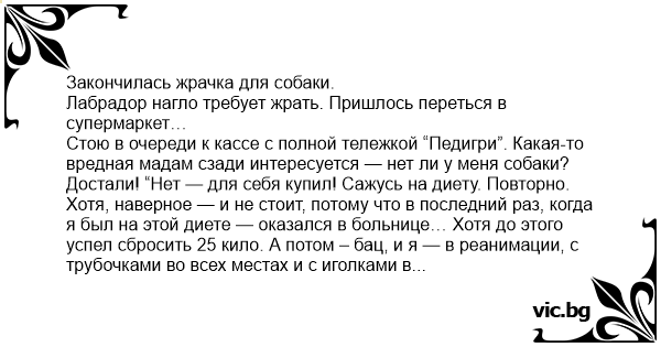 Стою в очереди к кассе c полной тележкой “Педигри”. Какая-то вредная мадам сзади интересуется — нет ли у меня собаки?
