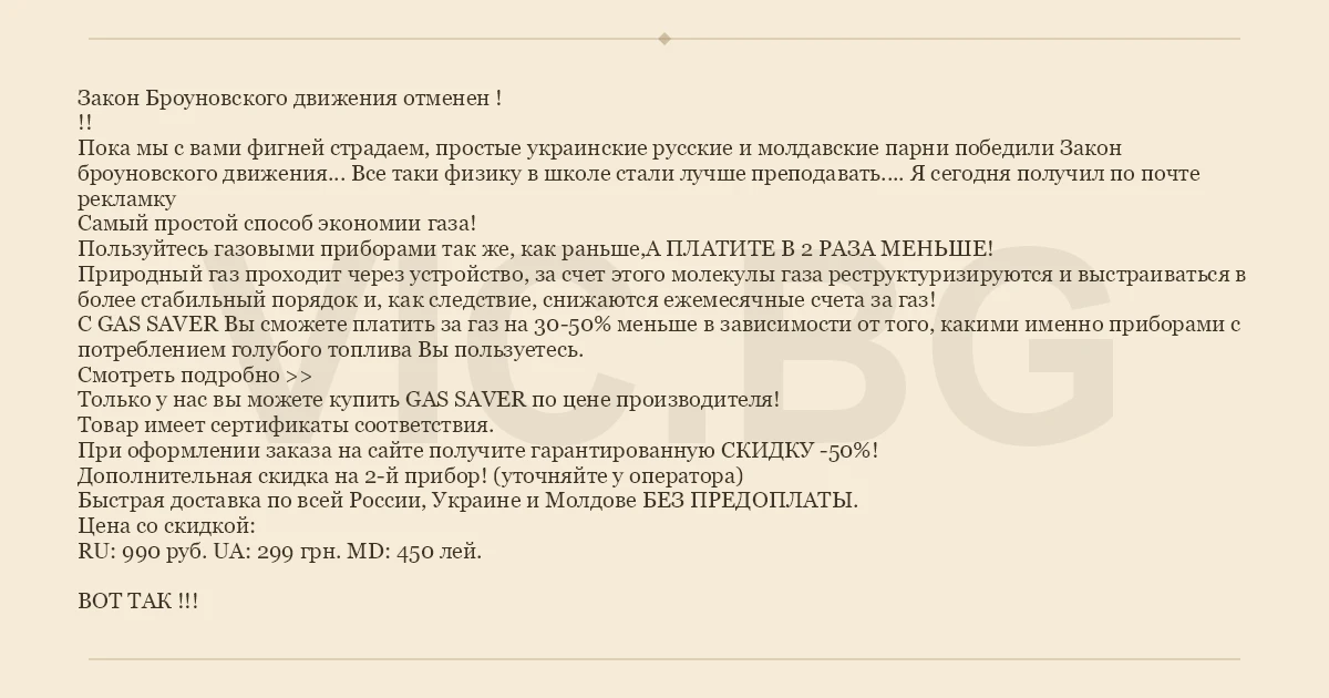 Закон Броуновского движения отменен ! !! Пока мы с вами фигней страдаем, простые украинские русские и молдавские парни победили Закон броуновского движения... Все таки физику в школе стали лучше преподавать.... Я сегодня получил по почте рекламку Самый простой способ экономии газа! Пользуйтесь газовыми приборами так же, как раньше,А ПЛАТИТЕ В 2 РАЗА МЕНЬШЕ! Природный газ проходит через устройство, за счет этого молекулы газа реструктуризируются и выстраиваться в более стабильный порядок и, как следствие, снижаются ежемесячные счета за газ! С GAS SAVER Вы сможете платить за газ на 30-50% меньше в зависимости от того, какими именно приборами с потреблением голубого топлива Вы пользуетесь. Смотреть подробно >> Только у нас вы можете купить GAS SAVER по цене производителя! Товар имеет сертификаты соответствия. При оформлении заказа на сайте получите гарантированную СКИДКУ -50%! Дополнительная скидка на 2-й прибор! (уточняйте у оператора) Быстрая доставка по всей России, Украине и Молдове БЕЗ ПРЕДОПЛАТЫ. Цена со скидкой: RU: 990 руб. UA: 299 грн. MD: 450 лей.