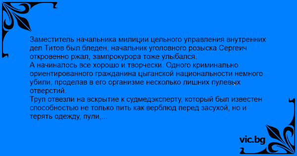 - "Представляешь, в этот момент я и заглянул к замначальнику милиции. На полу у него лежит потенциальный свидетель Ваня-цыганенок, а подполковник ему реанимационные мероприятия делает по указанию телевизионного диктора. Я охренел!"