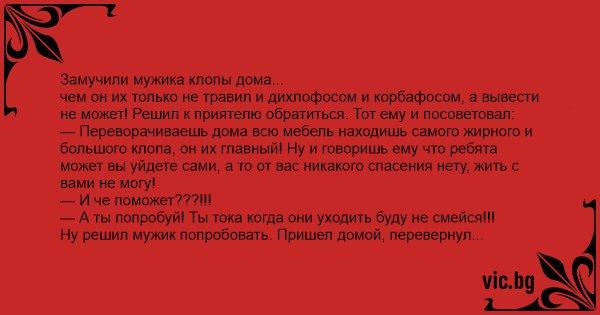 Замучили мужика клопы дома... чем он их только не травил и дихлофосом и корбафосом, а вывести не может! Решил к приятелю обратиться. Тот ему и посоветовал: — Переворачиваешь дома всю мебель находишь самого жирного и большого клопа, он их главный! Ну и говоришь ему что ребята может вы уйдете сами, а то от вас никакого спасения нету, жить с вами не могу! — И че поможет???!!! — А ты попробуй! Ты тока когда они уходить буду не смейся!!! Ну решил мужик попробовать. Пришел домой, перевернул все, нашел самого жирного клопа и говорит: — Мужики может вы уйдете... Жить с вами не могу... Надоели — Че серьезно?? — Да! — Ну ладно... Народ собирайся... уходим! Мужик наблюдает сцену к входной двери идет вереница клопов... Сначала самые упитанные и жирные, далее все мельче и мельче... последние идут инвалиды... на костылях хромают. Ну мужик не выдержал и заржал. Последний клоп оборачивается и кричит: — Мужики он ПОШУТИЛ!!!! Возвращаемся!!!