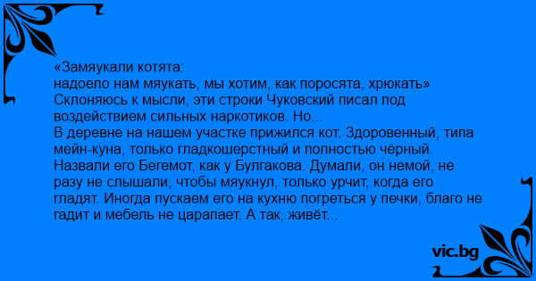 В деревне на нашем участке прижился кот. Здоровенный, типа мейн-куна, только гладкошерстный и полностью чёрный. Назвали его Бегемот, как у Булгакова. Думали, он немой, не разу не слышали, чтобы мяукнул, только урчит, когда его гладят. Иногда пускаем его на кухню погреться у печки, благо не гадит и мебель не царапает. А так, живёт на улице, и его миска стоит у двери в дом. Местные гастарбайтеры держат собаку, небольшую дворняжку, то ли щенка, то ли недоростка. Он обычно сидит на цепи, но иногда его отпускают побегать. Тогда псина лезет везде, куда можно залезть и подбирает всё съедобное. Забрался к нам на участок. Большая собака или человек не пролезли бы, а этот умудрился протиснуться между прутьями забора. На крыльце сидит Бегемот. Наша старая кошка, издали увидев собаку, обычно залезала на дерево, а при безысходности выгибала спину, прижимала уши и начинала шипеть, пытаясь царапнуть собаку за нос. Бегемот спокойно наблюдал, пока дворняжка не посягнула на кошачью миску с куриными объедками. Когда собака сунула нос в чужую еду, кот спрыгнул, подбежал к миске и, наступая на собаку медленным шагом, кот начал реалистично ЛАЯТЬ! Пёс, кажется, офигел не меньше, чем я, ушёл туда, откуда пришёл. А «собственность» Бегемота простояла нетронутой, пока он сам не съел.
