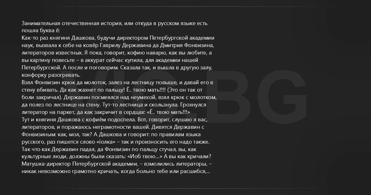 Занимательная отечественная история, или откуда в русском языке есть пошла буква ё: Как-то раз княгиня Дашкова, будучи директором Петербургской академии наук, вызвала к себе на ковёр Гаврилу Державина да Дмитрия Фонвизина, литераторов известных. Я пока, говорит, кофию наварю, как вы любите, а вы картину повесьте – в аккурат сейчас купила, для академии нашей Петербургской. А после и поговорим. Сказала так, и вышла в другую залу, конфорку разогревать. Взял Фонвизин крюк да молоток, залез на лестницу повыше, и давай его в стену вбивать. Да как жахнет по пальцу! Ё.. твою мать!!!! (Это он так от боли закричал). Державин посмеялся над неумехой, взял крюк с молотком, да полез по лестнице на стену. Тут-то лестница и скользнула. Грохнулся литератор на паркет, да как закричит в сердцах: «Ё.. твою мать!!!» Тут и княгиня Дашкова с кофиём подоспела. Вот, говорит, слушаю я вас, литераторов, и поражаюсь неграмотности вашей. Дивятся Державин с Фонвизиным: как, мол, так? А Дашкова и говорит: по правилам языка русского, раз пишется слово «iолка» – так и произносить его надо также. Так что как Державин падал, да Фонвизин по пальцу стучал, вы, как культурные люди, должны были сказать: «Иоб твою…» А вы как кричали? Матушка-директор Петербургской академии, – взмолились литераторы, – никак невозможно грамотно кричать, когда больно тебе или расшибся, например… Тут уж сразу вырывается: Ё!!! И решила директор Петербургской академии наук княгиня Дашкова: раз вырывается звук Ё! даже у литераторов известных, значит звук этот природный, в каждом русском человеке есть, а потому надо внести его в русский язык. С тех пор и появилась в нашем языке буква Ё. В ноябре прошлого года букве Ё! исполнилось 225 лет со дня рождения...