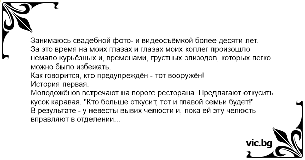 Молодожёнов встречают на пороге ресторана. Предлагают откусить кусок каравая. "Кто больше откусит, тот и главой семьи будет!"