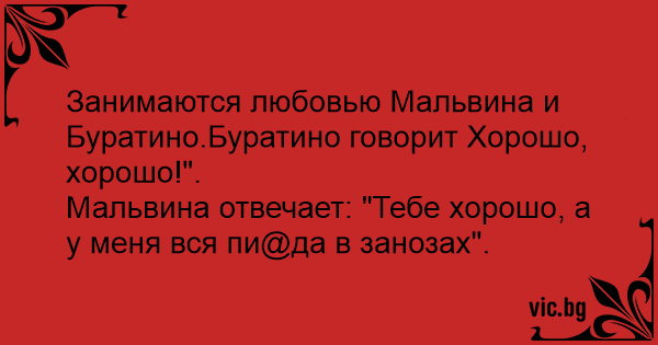 Занимаются любовью Мальвина и Буратино.Буратино говорит Хорошо, хорошо!".