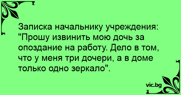 "Прошу извинить мою дочь за опоздание на работу. Дело в том, что у меня три дочери, а в доме только одно зеркало".