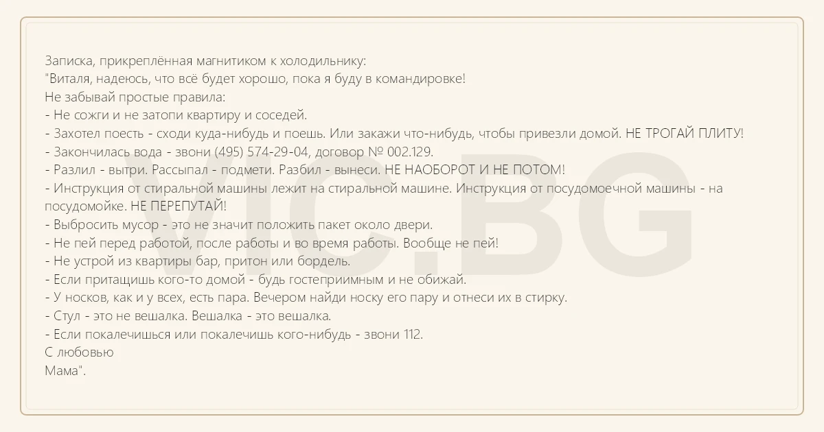 Записка, прикреплённая магнитиком к холодильнику: "Виталя, надеюсь, что всё будет хорошо, пока я буду в командировке! Не забывай простые правила: - Не сожги и не затопи квартиру и соседей. - Захотел поесть - сходи куда-нибудь и поешь. Или закажи что-нибудь, чтобы привезли домой. НЕ ТРОГАЙ ПЛИТУ! - Закончилась вода - звони (495) 574-29-04, договор № 002.129. - Разлил - вытри. Рассыпал - подмети. Разбил - вынеси. НЕ НАОБОРОТ И НЕ ПОТОМ! - Инструкция от стиральной машины лежит на стиральной машине. Инструкция от посудомоечной машины - на посудомойке. НЕ ПЕРЕПУТАЙ! - Выбросить мусор - это не значит положить пакет около двери. - Не пей перед работой, после работы и во время работы. Вообще не пей! - Не устрой из квартиры бар, притон или бордель. - Если притащишь кого-то домой - будь гостеприимным и не обижай. - У носков, как и у всех, есть пара. Вечером найди носку его пару и отнеси их в стирку. - Стул - это не вешалка. Вешалка - это вешалка. - Если покалечишься или покалечишь кого-нибудь - звони 112. С любовью Мама".