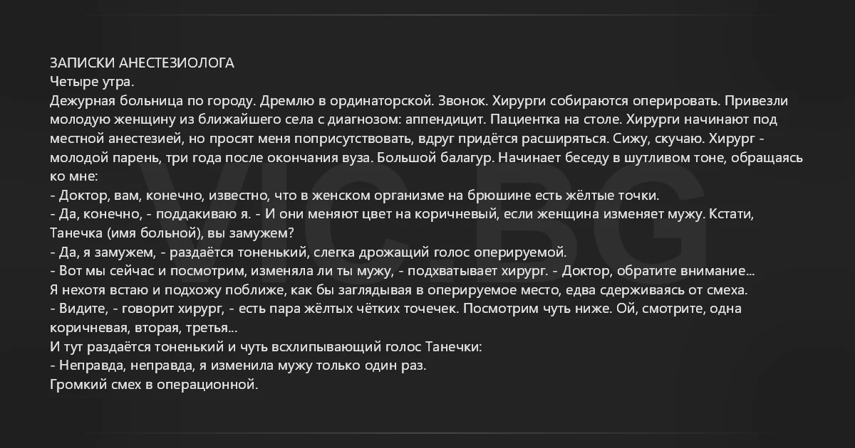 ЗАПИСКИ АНЕСТЕЗИОЛОГА Четыре утра. Дежурная больница по городу. Дремлю в ординаторской. Звонок. Хирурги собираются оперировать. Привезли молодую женщину из ближайшего села с диагнозом: аппендицит. Пациентка на столе. Хирурги начинают под местной анестезией, но просят меня поприсутствовать, вдруг придётся расширяться. Сижу, скучаю. Хирург - молодой парень, три года после окончания вуза. Большой балагур. Начинает беседу в шутливом тоне, обращаясь ко мне: - Доктор, вам, конечно, известно, что в женском организме на брюшине есть жёлтые точки. - Да, конечно, - поддакиваю я. - И они меняют цвет на коричневый, если женщина изменяет мужу. Кстати, Танечка (имя больной), вы замужем? - Да, я замужем, - раздаётся тоненький, слегка дрожащий голос оперируемой. - Вот мы сейчас и посмотрим, изменяла ли ты мужу, - подхватывает хирург. - Доктор, обратите внимание... Я нехотя встаю и подхожу поближе, как бы заглядывая в оперируемое место, едва сдерживаясь от смеха. - Видите, - говорит хирург, - есть пара жёлтых чётких точечек. Посмотрим чуть ниже. Ой, смотрите, одна коричневая, вторая, третья... И тут раздаётся тоненький и чуть всхлипывающий голос Танечки: - Неправда, неправда, я изменила мужу только один раз. Громкий смех в операционной.
