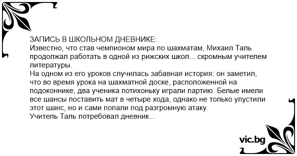 Учитель Таль потребовал дневник нарушителя дисциплины, где сделал строгую надпись для информации родителей: "Не нашёл мат в четыре хода на уроке литературы!".