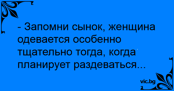 - Запомни сынок, женщина одевается особенно тщательно тогда, когда планирует раздеваться...