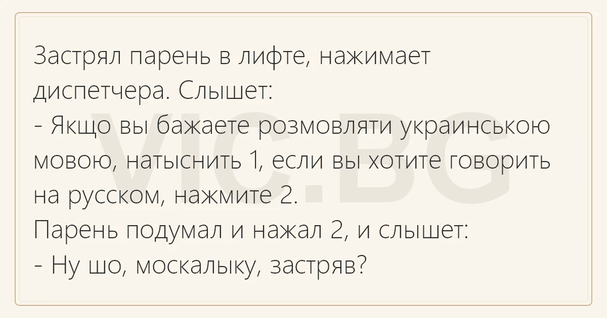Застрял парень в лифте, нажимает диспетчера. Слышет: - Якщо вы бажаете розмовляти украинською мовою, натыснить 1, если вы хотите говорить на русском, нажмите 2. Парень подумал и нажал 2, и слышет: - Ну шо, москалыку, застряв?