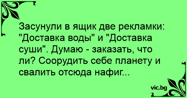 Засунули в ящик две рекламки: "Доставка воды" и "Доставка суши". Думаю - заказать, что ли? Соорудить себе планету и свалить отсюда нафиг...