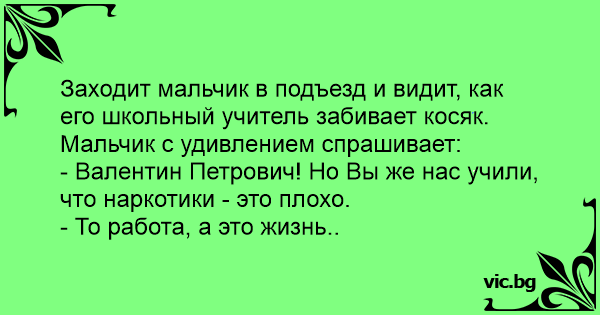 Заходит мальчик в подъезд и видит, как его школьный учитель забивает косяк. Мальчик с удивлением спрашивает: