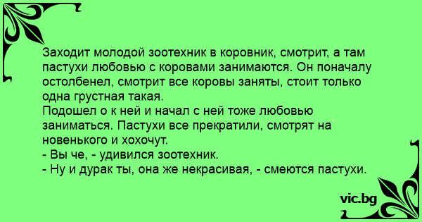 Заходит молодой зоотехник в коровник, смотрит, а там пастухи любовью с коровами занимаются. Он поначалу остолбенел, смотрит все коровы заняты, стоит только одна грустная такая.