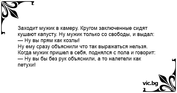 Заходит мужик в камеру. Кругом заключенные сидят кушают капусту. Ну мужик только со свободы, и выдал: