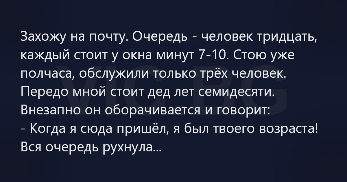 Захожу на почту. Очередь - человек тридцать, каждый стоит у окна минут 7-10. Стою уже полчаса, обслужили только трёх человек. Передо мной стоит дед лет семидесяти. Внезапно он оборачивается и говорит: - Когда я сюда пришёл, я был твоего возраста! Вся очередь рухнула...
