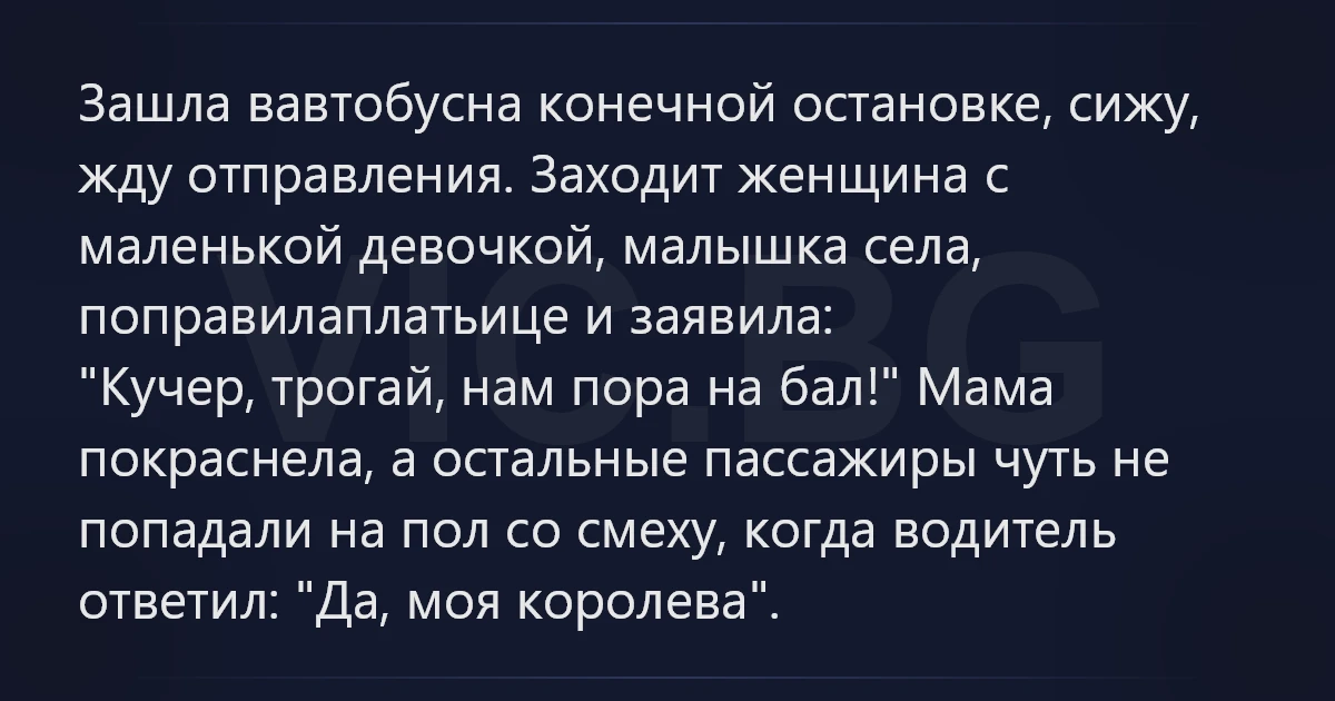 Зашла вавтобусна конечной остановке, сижу, жду отправления. Заходит женщина с маленькой девочкой, малышка села, поправилаплатьице и заявила: "Кучер, трогай, нам пора на бал!" Мама покраснела, а остальные пассажиры чуть не попадали на пол со смеху, когда водитель ответил: "Да, моя королева".