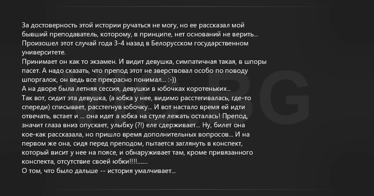 За достоверность этой истории ручаться не могу, но ее рассказал мой бывший преподаватель, которому, в принципе, нет оснований не верить... Произошел этот случай года 3-4 назад в Белорусском государственном университете. Принимает он как то экзамен. И видит девушка, симпатичная такая, в шпоры пасет. А надо сказать, что препод этот не зверствовал особо по поводу шпоргалок, он ведь все прекрасно понимал... :-)) А на дворе была летняя сессия, девушки в юбочках коротеньких... Так вот, сидит эта девушка, (а юбка у нее, видимо расстегивалась, где-то спереди) списывает, расстегнув юбочку... И вот настало время ей идти отвечать, встает и ... она идет а юбка на стуле лежать осталась! Препод, значит глаза вниз опускает, улыбку (?!) еле сдерживает... Ну, билет она кое-как рассказала, но пришло время дополнительных вопросов... И на первом же она, сидя перед преподом, пытается заглянуть в конспект, который висит у нее на поясе, и обнаруживает там, кроме привязанного конспекта, отсутствие своей юбки!!!!....... О том, что было дальше -- история умалчивает...