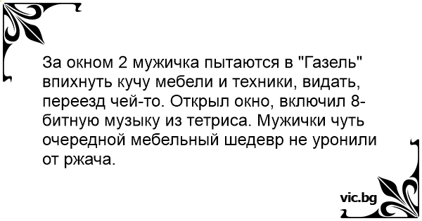 За окном 2 мужичка пытаются в "Газель" впихнуть кучу мебели и техники, видать, переезд чей-то. Открыл окно, включил 8-битную музыку из тетриса. Мужички чуть очередной мебельный шедевр не уронили от ржача.