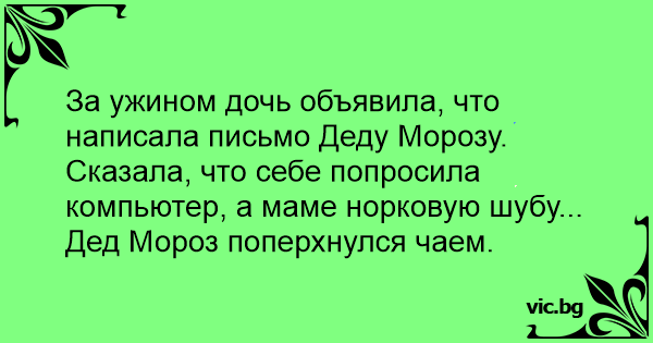 Когато седнаха да закусват, малката им дъщеря каза, че е писала на дядо Коледа и е поискала да и донесе iPhone 7, а за майка и палто от норки.