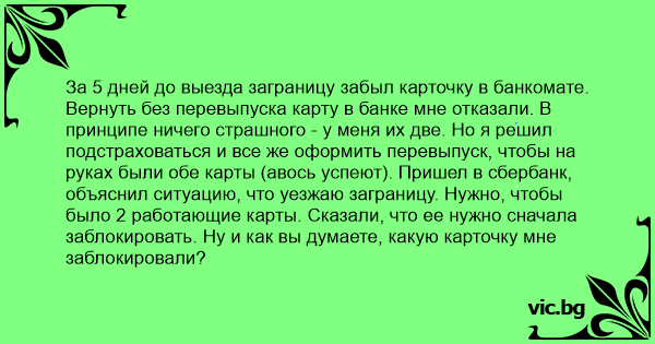 За 5 дней до выезда заграницу забыл карточку в банкомате. Вернуть без перевыпуска карту в банке мне отказали. В принципе ничего страшного - у меня их две. Но я решил подстраховаться и все же оформить перевыпуск, чтобы на руках были обе карты (авось успеют). Пришел в сбербанк, объяснил ситуацию, что уезжаю заграницу. Нужно, чтобы было 2 работающие карты. Сказали, что ее нужно сначала заблокировать. Ну и как вы думаете, какую карточку мне заблокировали?