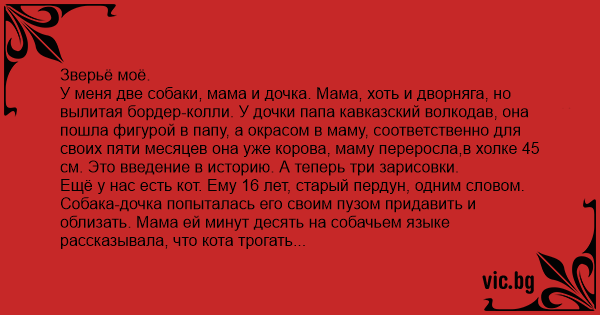 У меня две собаки, мама и дочка. Мама, хоть и дворняга, но вылитая бордер-колли. У дочки папа кавказский волкодав, она пошла фигурой в папу, а окрасом в маму, соответственно для своих пяти месяцев она уже корова, маму переросла,в холке 45 см. Это введение в историю. А теперь три зарисовки.