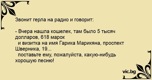 - Вчера нашла кошелек, там было 5 тысяч долларов, 618 марок и визитка на имя Гарика Марикяна, проспект Шверника, 19... поставьте ему, пожалуйста, какую-нибудь хорошую песню!