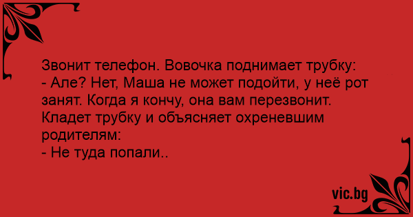 - Але? Нет, Маша не может подойти, у неё рот занят. Когда я кончу, она вам перезвонит.