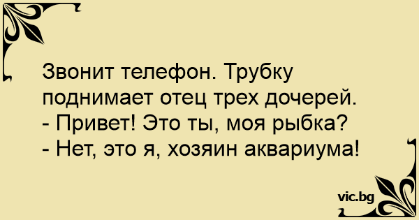 Ѕвони телефонот. На телефон се јавува таткото на три ќерки. - Здраво! - Ти ли си рипче мое? - Не, овде е сопственикот на аквариумот!