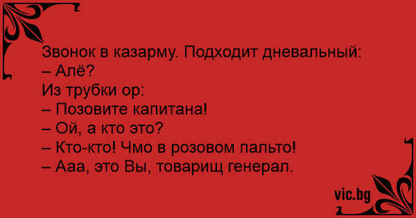 Звонок в казарму. Подходит дневальный:<br />– Алё?<br />Из трубки ор:<br />– Позовите капитана!<br />– Ой, а кто это?<br />– Кто-кто! Чмо в розовом пальто!<br />– Ааа, это Вы, товарищ генерал.