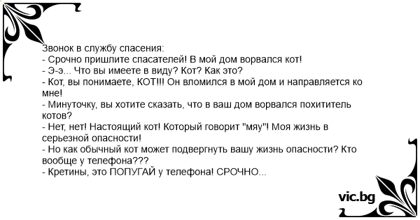 - Alo? 112? - Da! - Ajutor! A intrat o pisică în casă! - Şi... pentru asta apelezi numărul de urgenţă, puştiule? - Nu sunt puşti! Sunt papagalul Coco şi vorbesc în numele hamsterului Rocky şi al...
