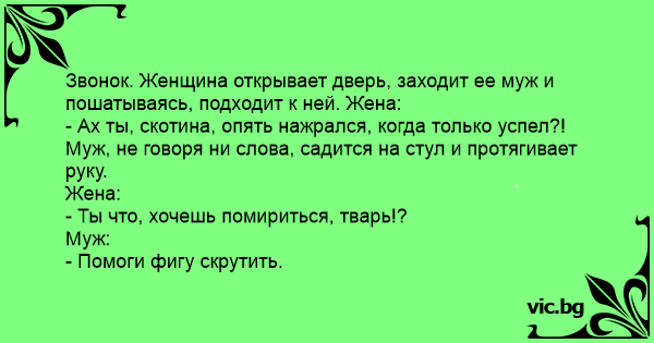 Звонок. Женщина открывает дверь, заходит ее муж и пошатываясь, подходит к ней. Жена: