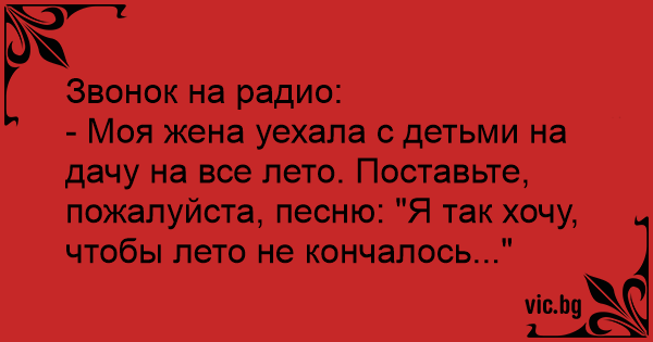 - Моя жена уехала с детьми на дачу на все лето. Поставьте, пожалуйста, песню: "Я так хочу, чтобы лето не кончалось..."
