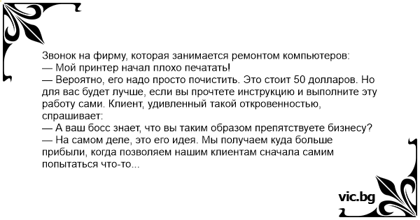 — Вероятно, его надо просто почистить. Это стоит 50 долларов. Но для вас будет лучше, если вы прочтете инструкцию и выполните эту работу сами. Клиент, удивленный такой откровенностью, спрашивает:
