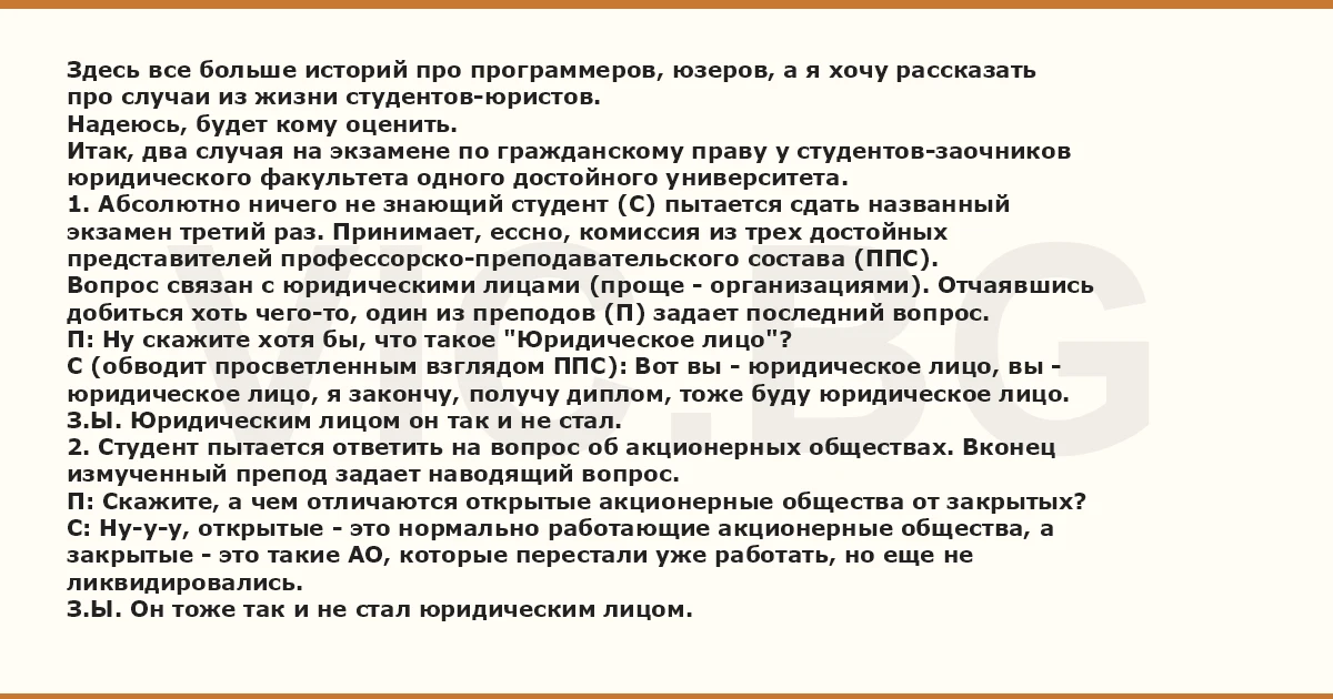 Здесь все больше историй про программеров, юзеров, а я хочу рассказать про случаи из жизни студентов-юристов. Надеюсь, будет кому оценить. Итак, два случая на экзамене по гражданскому праву у студентов-заочников юридического факультета одного достойного университета. 1. Абсолютно ничего не знающий студент (С) пытается сдать названный экзамен третий раз. Принимает, ессно, комиссия из трех достойных представителей профессорско-преподавательского состава (ППС). Вопрос связан с юридическими лицами (проще - организациями). Отчаявшись добиться хоть чего-то, один из преподов (П) задает последний вопрос. П: Ну скажите хотя бы, что такое "Юридическое лицо"? С (обводит просветленным взглядом ППС): Вот вы - юридическое лицо, вы - юридическое лицо, я закончу, получу диплом, тоже буду юридическое лицо. З.Ы. Юридическим лицом он так и не стал. 2. Студент пытается ответить на вопрос об акционерных обществах. Вконец измученный препод задает наводящий вопрос. П: Скажите, а чем отличаются открытые акционерные общества от закрытых? С: Ну-у-у, открытые - это нормально работающие акционерные общества, а закрытые - это такие АО, которые перестали уже работать, но еще не ликвидировались. З.Ы. Он тоже так и не стал юридическим лицом.