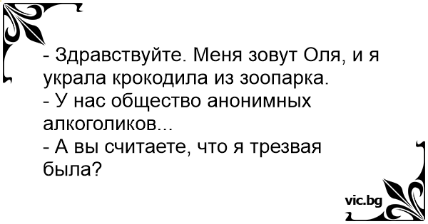 - Здравствуйте. Меня зовут Оля, и я украла крокодила из зоопарка.