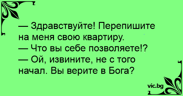 — Здравствуйте! Перепишите на меня свою квартиру.