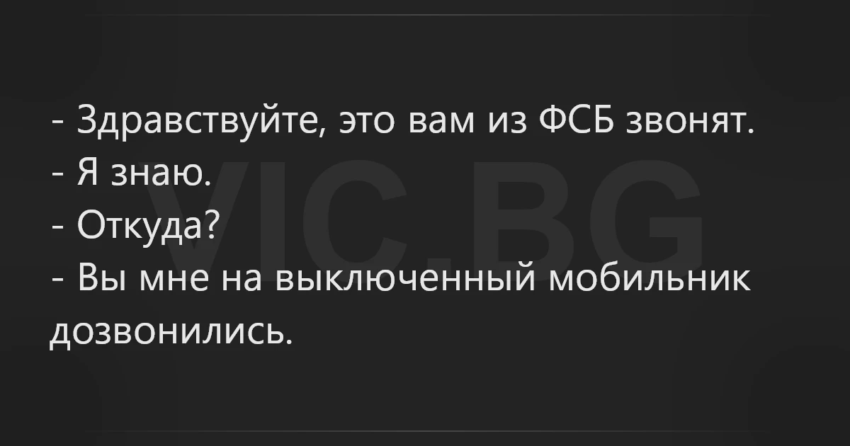 - Здравствуйте, это вам из ФСБ звонят. - Я знаю. - Откуда? - Вы мне на выключенный мобильник дозвонились.